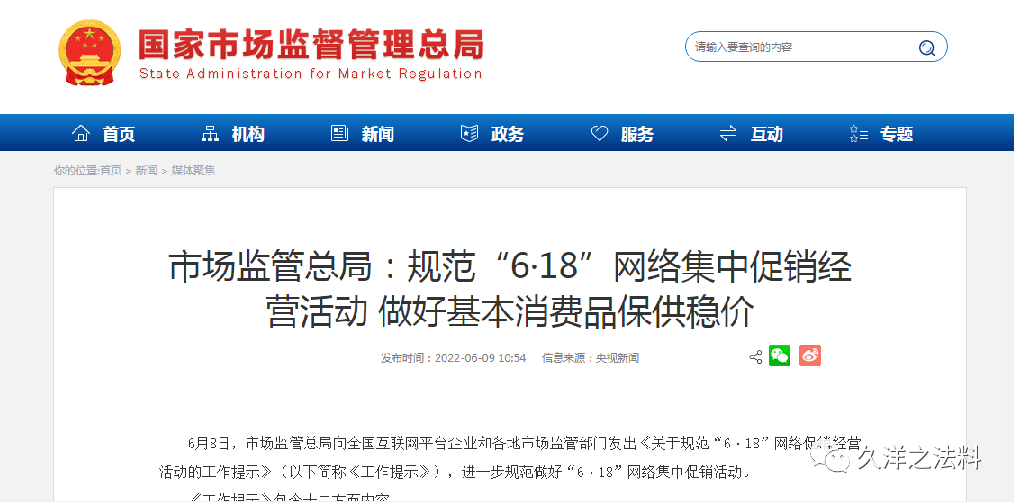 6月8日,市场监管总局向全国互联网平台企业和各地市场监管部门发出《关于规范“6·18”网络促销经营活动的工作提示》(以下简称《工作提示》),进一步规范做好“6·18”网络集中促销活动。
