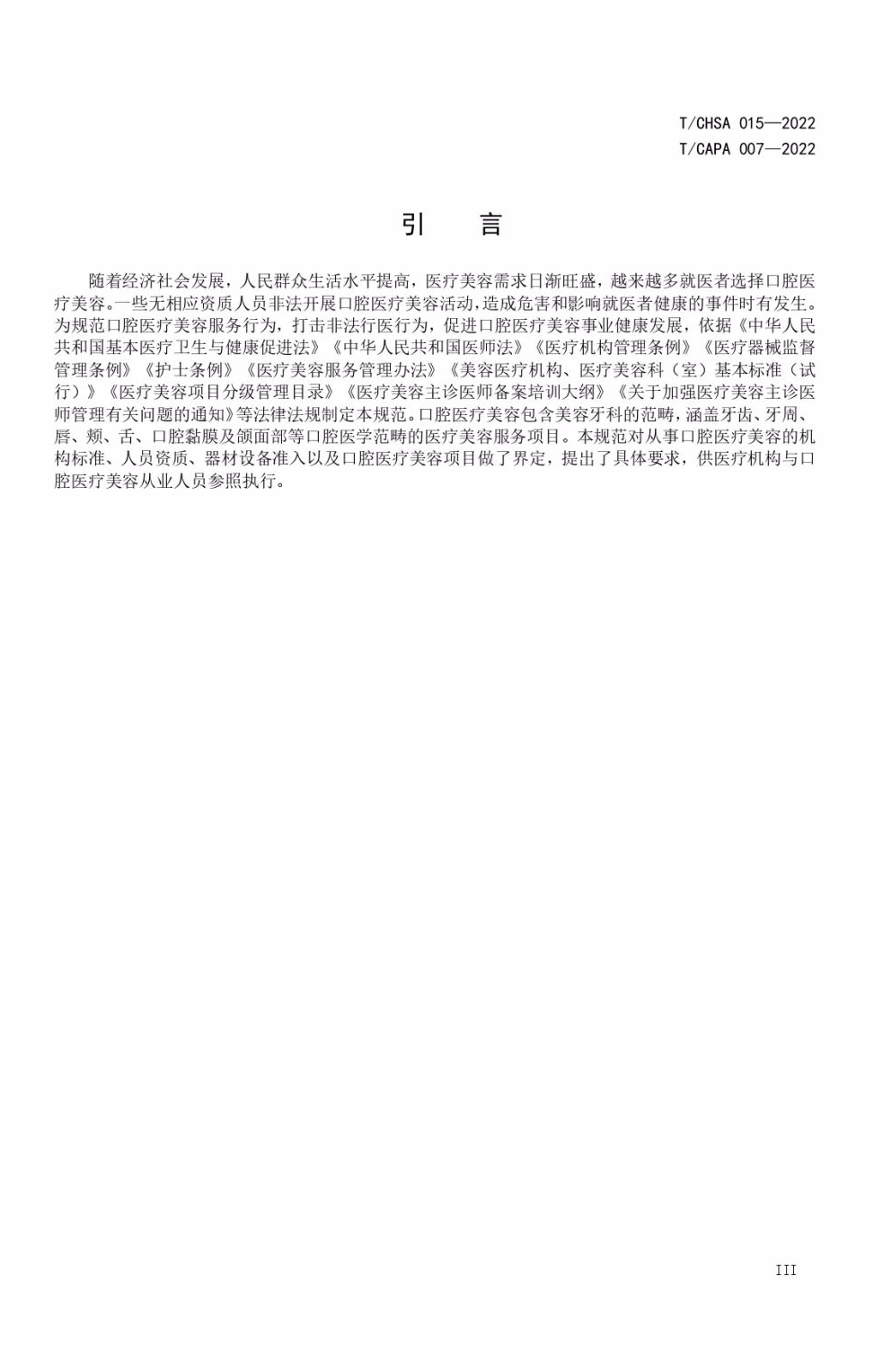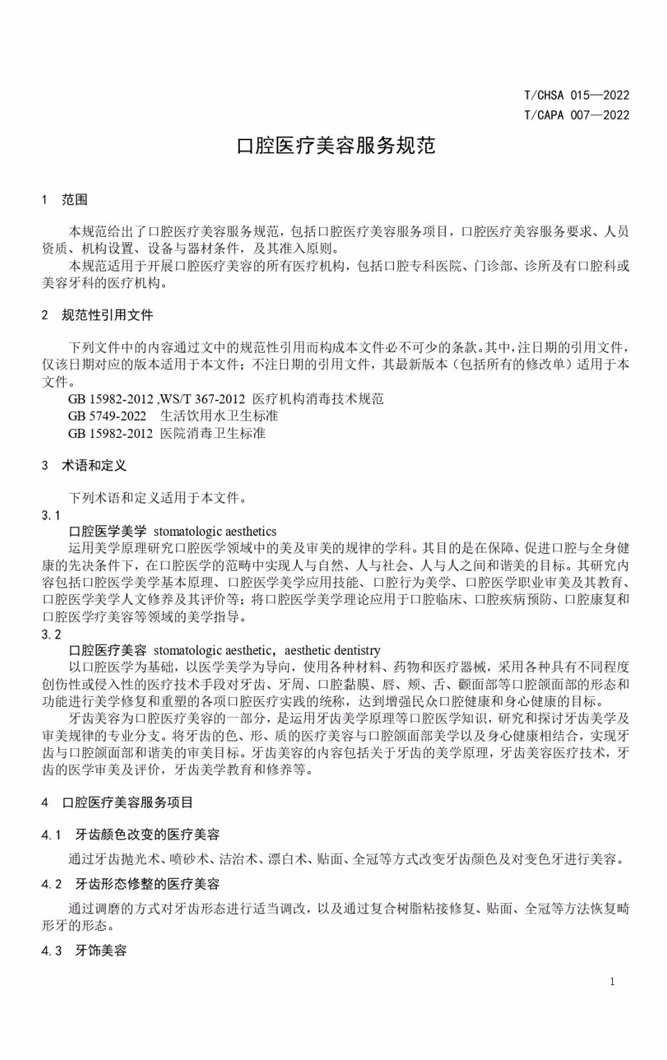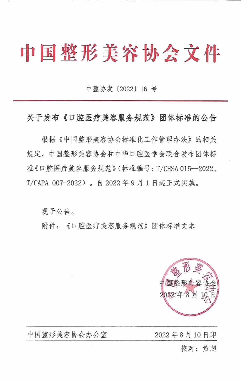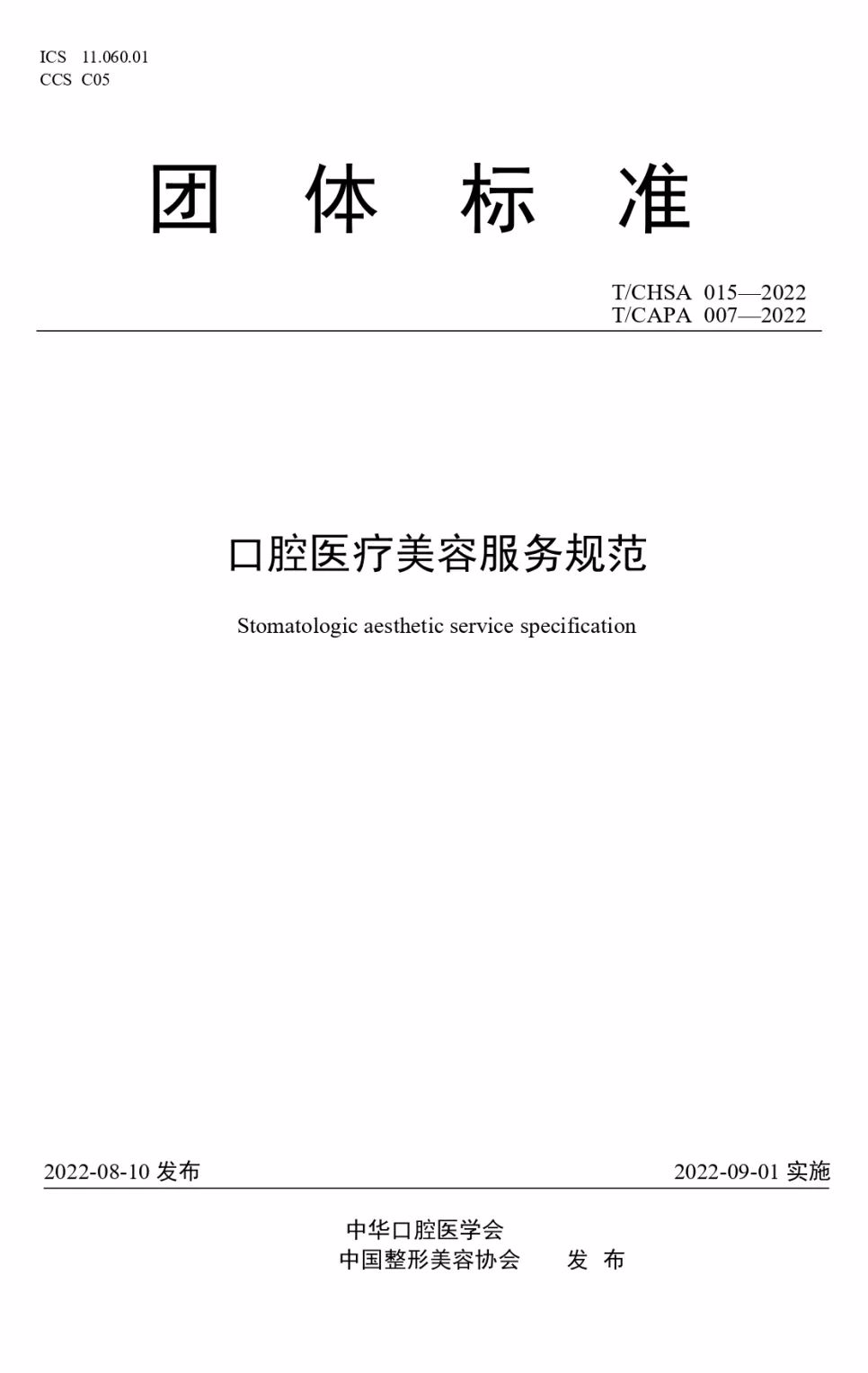 8月10日,中国整形美容协会和中华口腔医学会联合发布团体标准《口腔医疗美容服务规范》(标准编号: T/CHSA 015—2022、T/CAPA 007-2022)。此标准系根据《中国整形美容协会标准化工作管理办法》的相关规定编写,将从2022年9月1日起正式实施。《口腔医疗美容服务规范》团体标准内容如下: