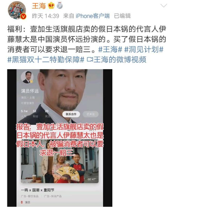 (三) 当事人于2019年 8月开始,在天猫、京东平台销售页面发布视频广告,视频中宣传日本铸器世家伊藤家族,由该家族第四代传人伊藤慧太宣传壹加铁锅, 并配有“古法手工制锅,百年技艺传承, 壹加生活与伊藤家珠联璧合, 造就了百年古法的技艺得以传承” 等字幕内容。经查证,该视频中的日本伊藤家族为当事人虚构, 伊藤慧太由一名中国演员扮演。通过调查当事人《第三方设计、 拍摄服务合同》 复印件、付款凭证截图打印件,该视频拍摄费用为 9116 元, 但视频后期制作以及发布均为当事人自行操作, 故该视频广告费用无法计算。