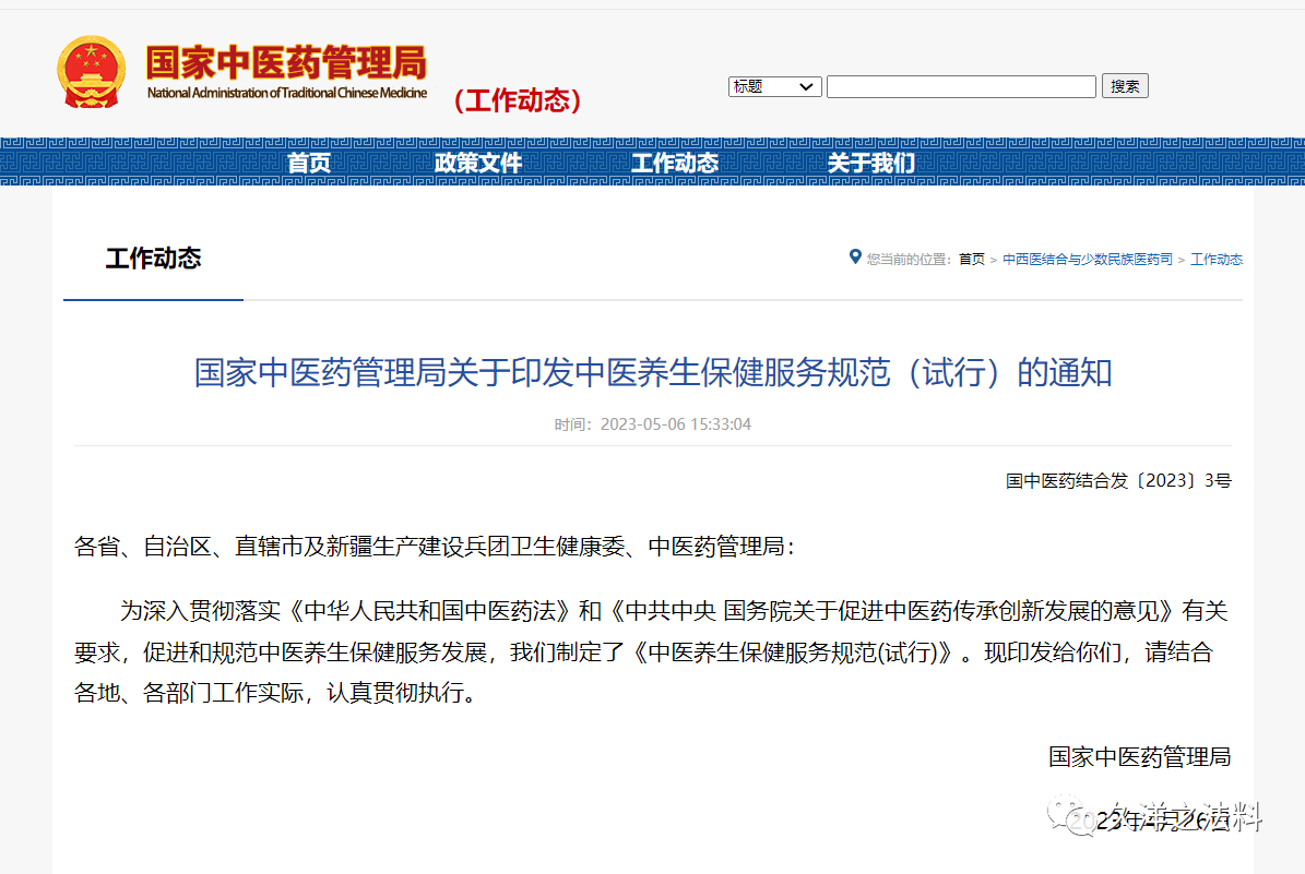 为深入贯彻落实《中华人民共和国中医药法》和《中共中央 国务院关于促进中医药传承创新发展的意见》有关要求,促进和规范中医养生保健服务发展,我们制定了《中医养生保健服务规范(试行)》。现印发给你们,请结合各地、各部门工作实际,认真贯彻执行。