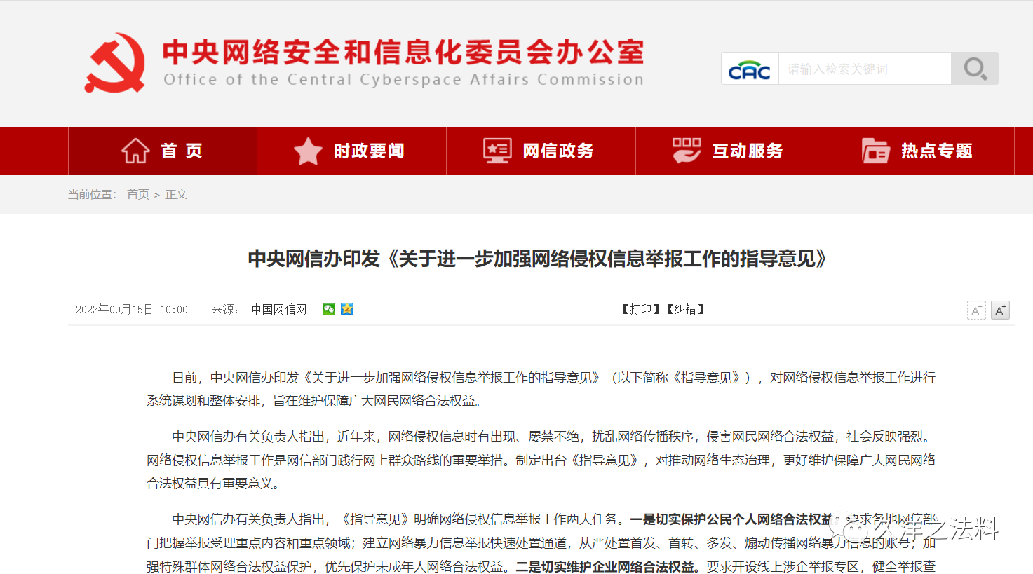 中央网信办印发《关于进一步加强网络侵权信息举报工作的指导意见》