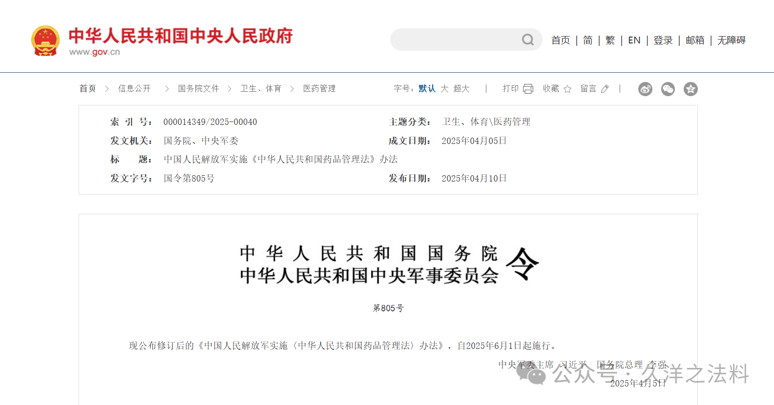 现公布修订后的《中国人民解放军实施〈中华人民共和国药品管理法〉办法》,自2025年6月1日起施行。 中央军委主席 习近平 国务院总理 李强 2025年4月5日 中国人民解放军实施 《中华人民共和国药品管理法》办法 (2004年12月9日中华人民共和国国务院、中华人民共和国中央军事委员会令第425号公布 2025年4月5日中华人民共和国国务院、中华人民共和国中央军事委员会令第805号修订) 第一章 总 则 第一条 为了加强军队药品管理,根据《中华人民共和国药品管理法》和其他有关法律规定,制定本办法。 第二条 军队药品研制、生产(含配制,下同)、储备、供应、使用和监督管理活动,适用本办法。 第三条 军队药品管理工作坚持中国共产党的领导,贯彻习近平强军思想,坚持风险管理、全程管控、军地协同的原则,科学严格监管,保障药品的安全、有效、可及。 第四条 在中央军事委员会领导下,中央军事委员会后勤保障部负责组织指导军队药品监督管理工作,具体工作由中央军事委员会后勤保障部负责卫生工作的业务部门承办;中央军事委员会机关其他部门按照职责分工做好与药品有关的监督管理工作。 军队团级以上单位后勤保障部门负责本系统、本单位药品监督管理工作以及药品安全突发事件应对工作;同级机关其他部门按照职责分工做好与药品有关的监督管理工作。 第五条 中央军事委员会后勤保障部负责卫生工作的业务部门与国务院药品监督管理部门和省、自治区、直辖市人民政府药品监督管理部门建立注册审评、联合监管、专业培训、信息通报等工作协调机制,协同开展药品监督管理工作。 国务院药品监督管理部门和县级以上地方人民政府承担药品监督管理职责的部门,按照本办法规定履行相应的药品监督管理职责。 第六条 军队药品专业技术机构依法承担军队药品监督管理所需的审评、检验、核查、监测与评价等工作。 第七条 军队单位应当按照国家和军队药品追溯有关标准和规范加强管理,实现药品可追溯。 军队单位应当按照国家和军队药物警戒有关规定,对药品不良反应及其他与用药有关的有害反应进行监测、识别、评估和控制。 第八条 对在军队药品研制、生产、储备、供应、使用和监督管理工作中做出突出贡献的单位和个人,按照国家和军队有关规定给予表彰、奖励。 第二章 药品储备与供应 第九条 军队实行战备药品储备制度。 中央军事委员会后勤保障部与国务院有关部门建立军队战备药品和国家储备药品调用协作机制,保障发生战争以及重大灾情、疫情或者其他突发事件时药品应急使用需要。 第十条 军队建立军队基本药物目录,提高基本药物的储备和供给能力,满足军队人员伤病防治基本用药需求。 第十一条 军队医疗机构、药材供应保障机构应当从药品上市许可持有人或者具有药品生产、经营资格的企业购进药品;但是,购进未实施审批管理的中药材除外。 第十二条 军队医疗机构、药材供应保障机构购进药品,应当建立并执行进货检查验收制度,验明药品合格证明和其他标识,有真实、完整、可追溯的药品购进记录。 药品购进记录应当注明药品的通用名称、剂型、规格、产品批号、有效期、上市许可持有人、生产企业、供货单位、购进数量、购进价格、购进日期以及国务院药品监督管理部门规定的其他相关内容。 军队医疗机构、药材供应保障机构应当制定和执行药品保管制度,采取必要的冷藏、防冻、防潮、防虫、防鼠等措施,保证药品质量。 第十三条 军队药材供应保障机构应当按照划定区域和指定任务,负责军队单位所需药品的供应保障。 军队药材供应保障机构不得向地方单位和人员供应药品;因发生重大灾情、疫情或者其他突发事件等原因,确需向地方单位和人员供应的,应当经中央军事委员会后勤保障部批准。 第十四条 军队药材供应保障机构从事药品供应保障活动,应当取得中央军事委员会后勤保障部负责卫生工作的业务部门核发的军队药材供应许可证;无军队药材供应许可证的,不得供应药品。 第十五条 军队人员需要接种的疫苗,由军队疾病预防控制机构按照国家规定的疫苗采购渠道向疫苗上市许可持有人采购;对未纳入国家组织采购的疫苗,可以按照军队采购有关规定向疫苗上市许可持有人采购。疫苗上市许可持有人应当按照采购合同约定,向军队疾病预防控制机构或者其指定的军队单位供应疫苗。 军队疾病预防控制机构和军队其他相关单位从事疫苗储存、运输活动的,应当严格遵守国家有关规定,保证疫苗质量。 第三章 军队医疗机构药事管理 第十六条 军队医疗机构应当配备经过国家或者军队资格认定的药师或者其他药学技术人员,负责本单位的药品管理、处方审核和调配、合理用药指导等工作。 第十七条 军队医疗机构应当坚持安全有效、经济合理的用药原则。 第十八条 军队医疗机构配制制剂,应当取得中央军事委员会后勤保障部负责卫生工作的业务部门核发的军队医疗机构制剂许可证。 军队医疗机构配制的制剂,应当是本单位临床需要而市场上没有供应或者任务急需但市场供应不足的品种,并应当取得中央军事委员会后勤保障部负责卫生工作的业务部门或者军兵种负责卫生工作的业务部门核发的制剂批准证明文件;但是,法律对配制中药制剂另有规定的除外。 第十九条 军